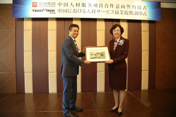 2016年5月18日上午,聯(lián)橋集團與株式會社TRUST TECH“中國人材服務(wù)項目合作意向簽約儀式”在東京舉行,聯(lián)橋集團董事長慕镕鍵與株式會社TRUST TECH社長西田穣代表雙方簽署了合作協(xié)議,威海市委副書記、市長張惠,高區(qū)黨工委書記、管委會主任劉偉,威海市商務(wù)局局長鄧勇,聯(lián)橋集團董事、副總經(jīng)理于福杰等領(lǐng)導(dǎo)出席儀式。