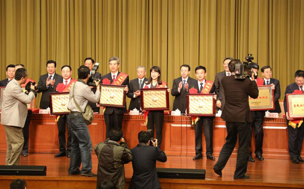 4月28日,山東省委書記劉家義、省長龔正等領(lǐng)導(dǎo)為山東省獲獎單位授獎。聯(lián)橋集團黨委副書記宋威麗代表公司接受了省長龔正親自頒發(fā)的榮譽獎牌。